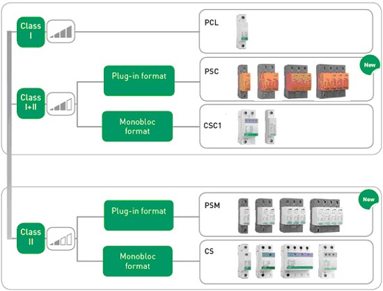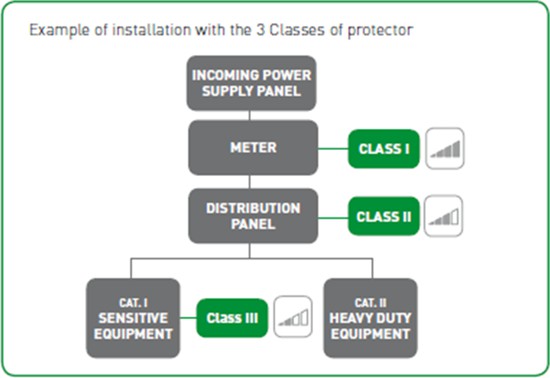 High Protection Level (Up). Class I protector are required where a direct impact of lightning are expected or there is a lightning protection system. These protectors must be installed at the main incomer due its high discharge capacity and the main incomer expects the highest exposure to overvoltage. Must be accompanied by downstream Class II protector.